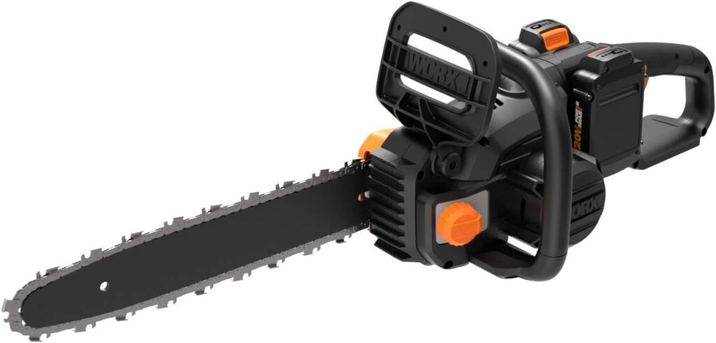 The WORX WG384 runs on a 40V battery and delivers smooth cutting performance for most residential tasks. The 14-inch bar handles logs up to about 12 inches in diameter, which covers the vast majority of homeowner needs.