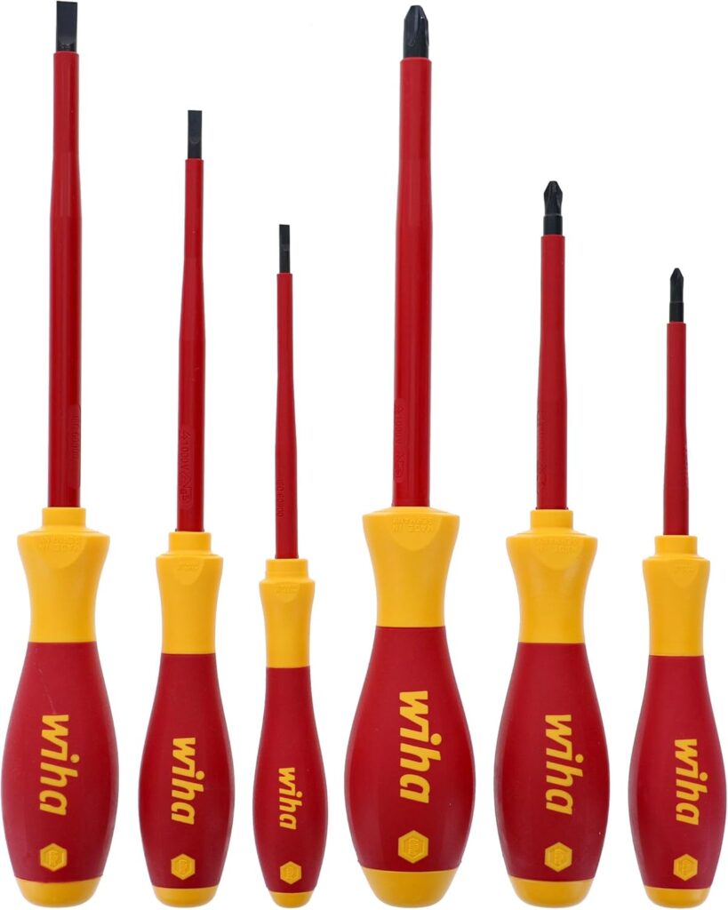 The screwdrivers in this set feature slim, insulated handles designed to fit into tight panel spaces and terminal blocks. The tips are hardened and precisely ground to engage fasteners firmly without slipping, which matters when you are working inside a breaker box or tightening terminal screws.
